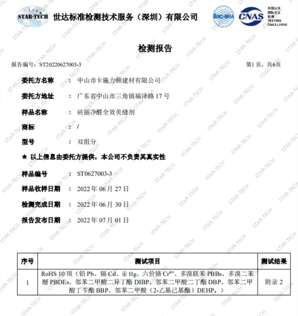 經檢測我司旗下磚麗、大獅、德蘭麗格品牌的所有產品全部通過RoHS10項指標,不含鉛、汞等重金屬及有害物質。美縫劑常做的檢測中,很少有關于重金屬的檢測,我們選擇了專門檢測重金屬的RoHS10項指令,它是歐盟(Eu)對進入歐洲市場電子電氣產品限制使用10種有害物質的禁令。我們目前對產品做了全方面的檢測,一般美縫劑廠家只敢做部分檢測。