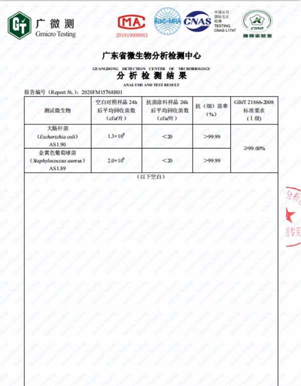 抗菌防霉檢測報告: