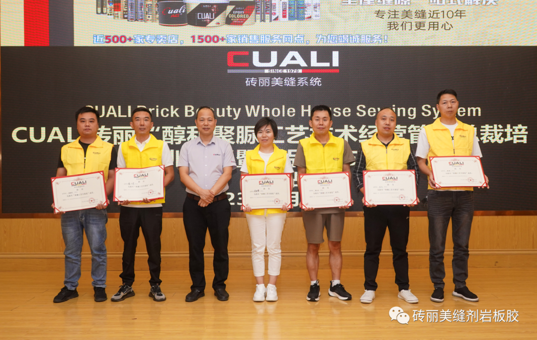 會(huì)議最后,聘請(qǐng)傅總、張總、邢總、馮總、朱總、徐總為磚麗總部“美縫工藝專家組”專家。并為考核合格的經(jīng)銷商頒發(fā)畢業(yè)證書,對(duì)表現(xiàn)優(yōu)秀的“精英團(tuán)隊(duì)”頒發(fā)了“冠軍團(tuán)隊(duì)”獎(jiǎng)項(xiàng)!至此,CUALI磚麗美縫“醇和聚脲美縫工藝”培訓(xùn)會(huì)暨“瓷磚空鼓修復(fù)焊接膠”新品發(fā)布會(huì)長(zhǎng)沙站圓滿成功!