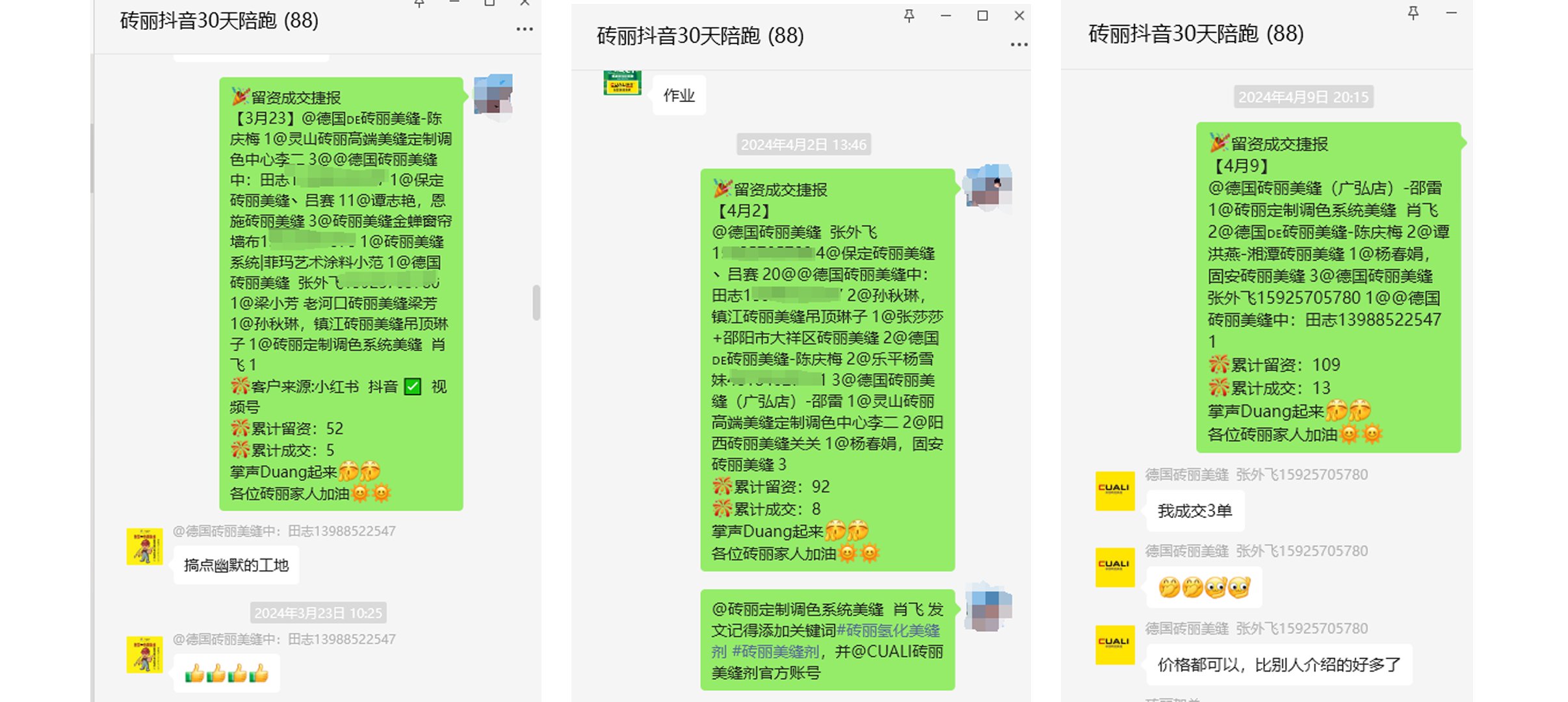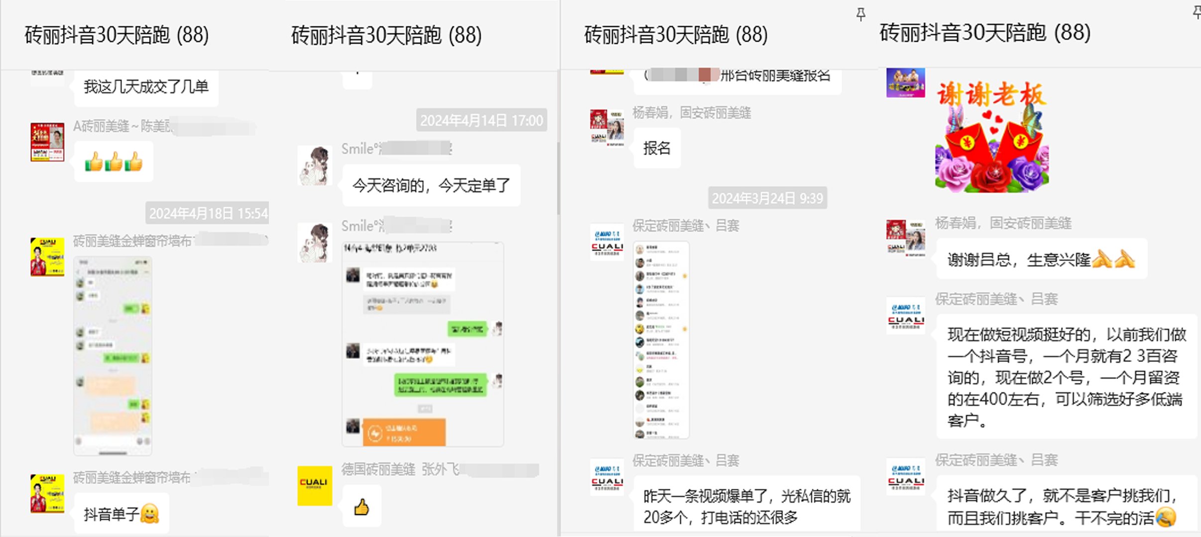 在第一期的陪跑活動中,大部分經銷商賬號實現從0到1的成長蛻變,經銷商的技能也在不斷升級,期間不斷涌現出許多優質磚麗美縫同城賬號!